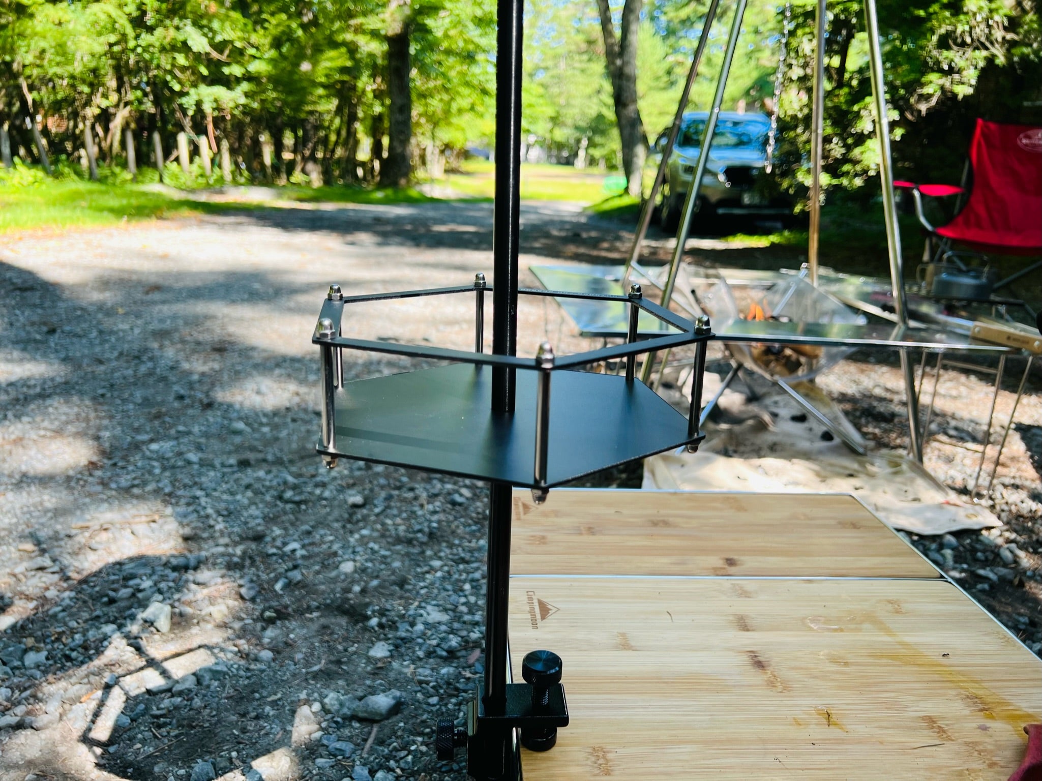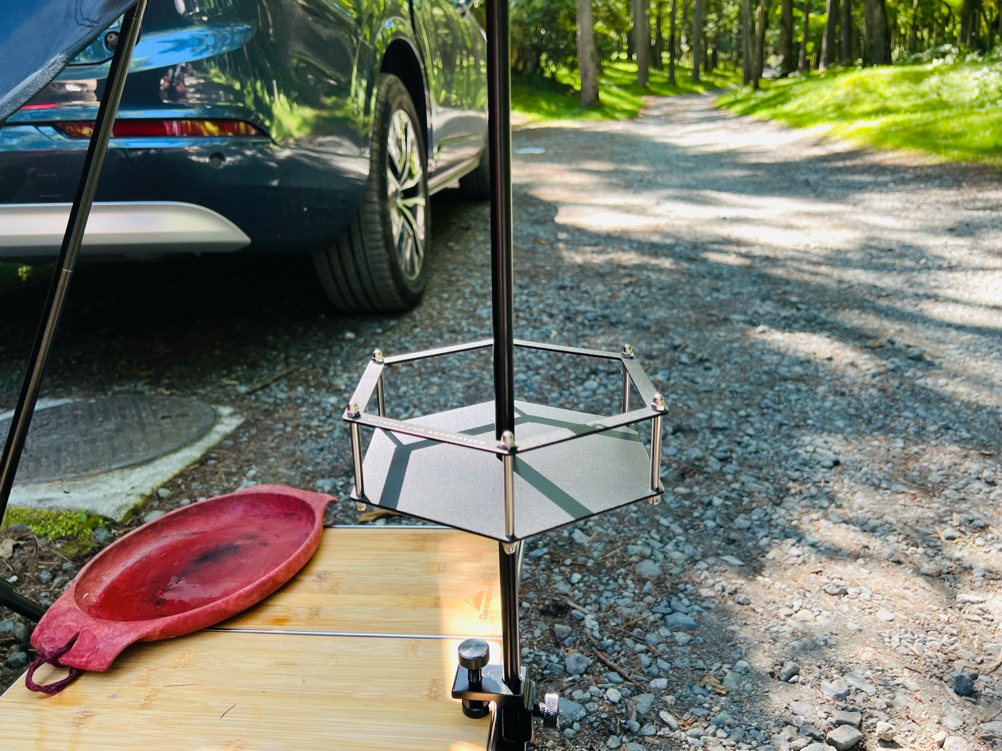 ポールの中央に「PLATE」を組み立てて設置することで調味料やトーチバーナーなどを置いておくのにとても便利な収納スペースをつくることができます。