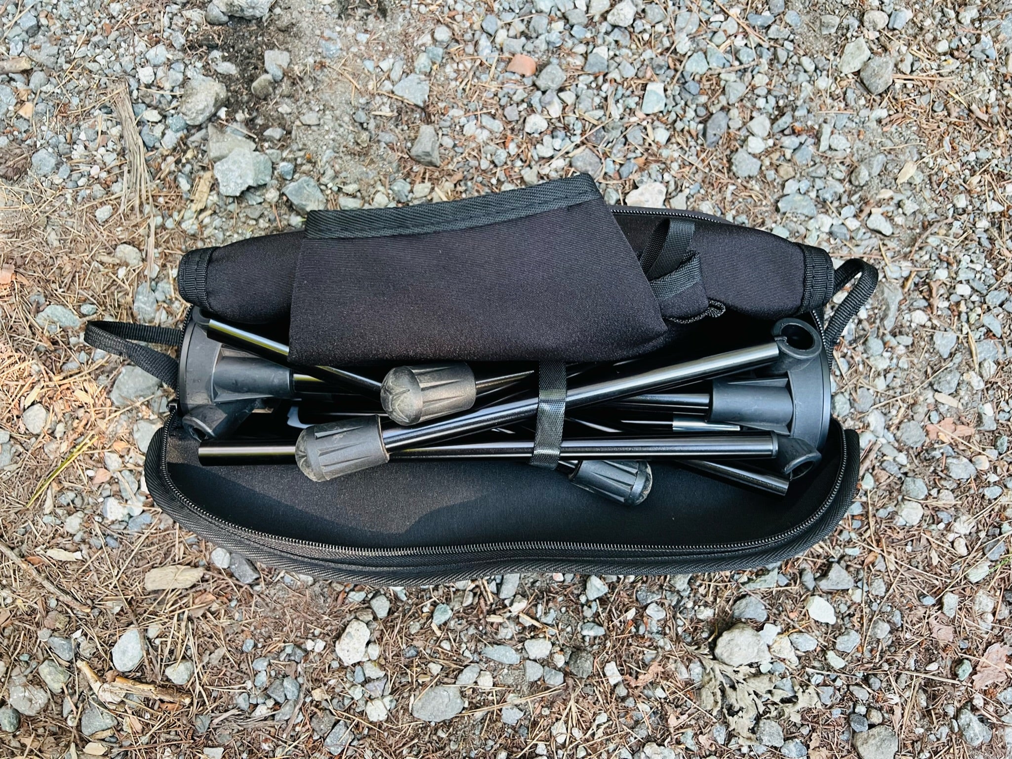 重さがたった1.35kg、ケースに収納したら高さ14cm、幅39cm、奥行き14.5cmまで小さくなるので、荷物が増えがちなキャンプでもコンパクトに持ち運べます。