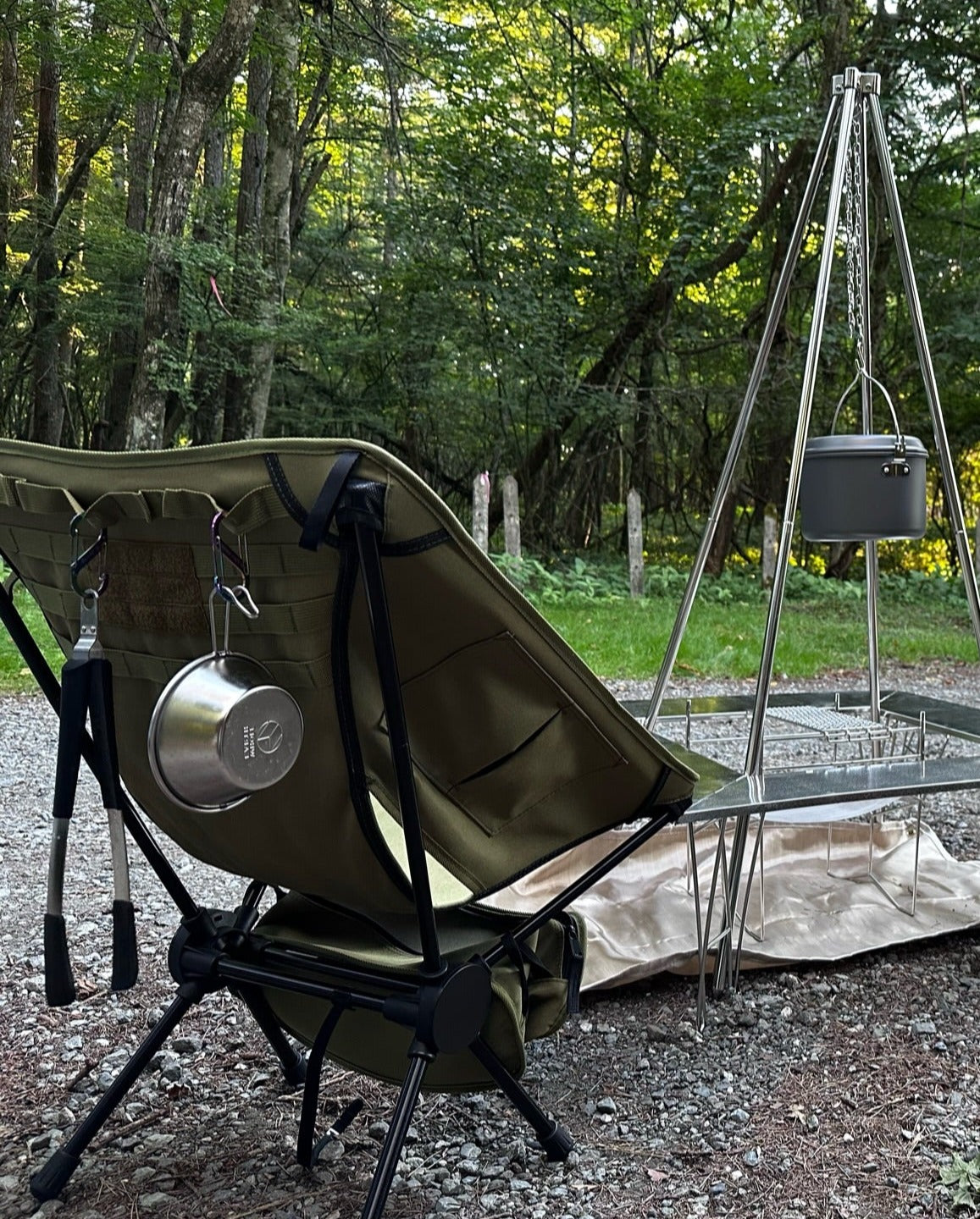 市販のカラビナを引っ掛ければ、シェラカップや調理グッズなど地面には置きたくないけど、テーブルに置いておくと場所を取ってしまうアイテムをスッキリと収納することが可能です。とても便利です。
