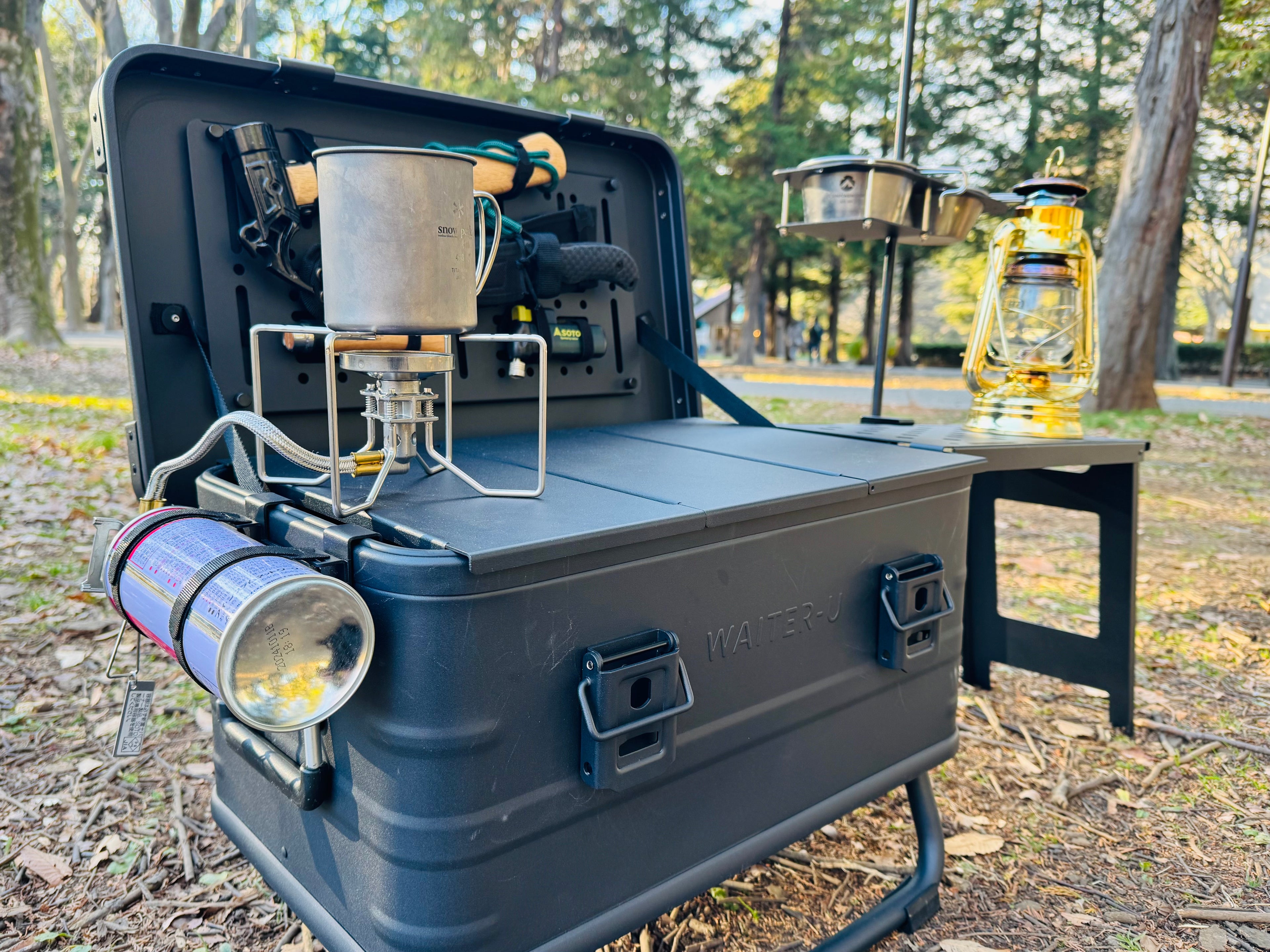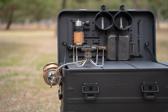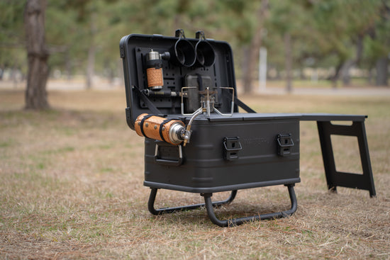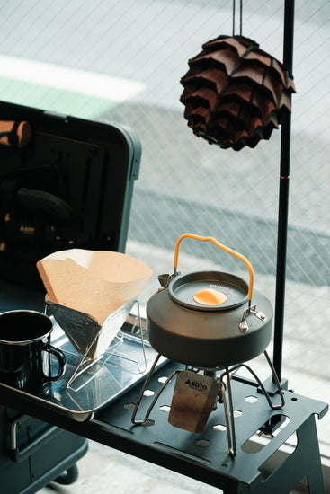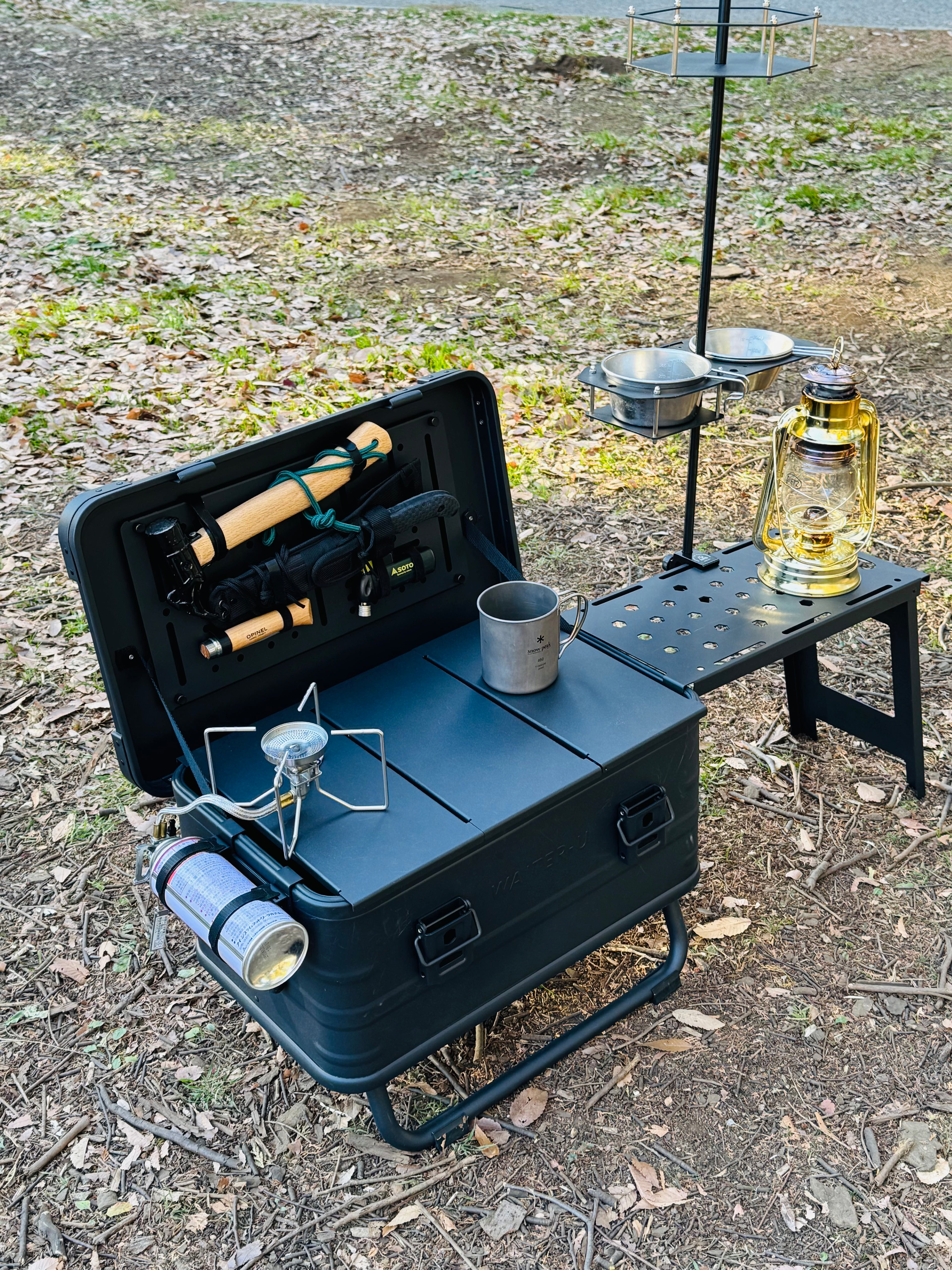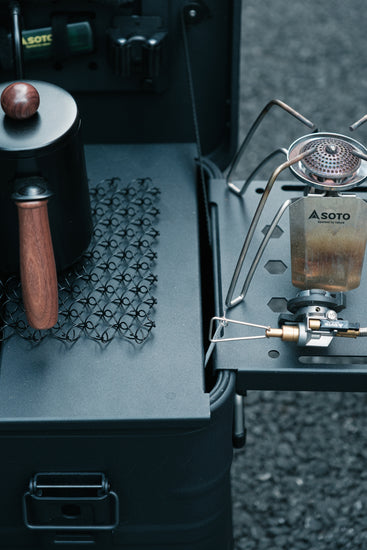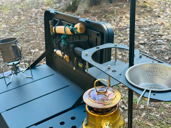 - CB缶を横面にセットしてお持ちのバーナーをセットすれば作業台キッチンになります