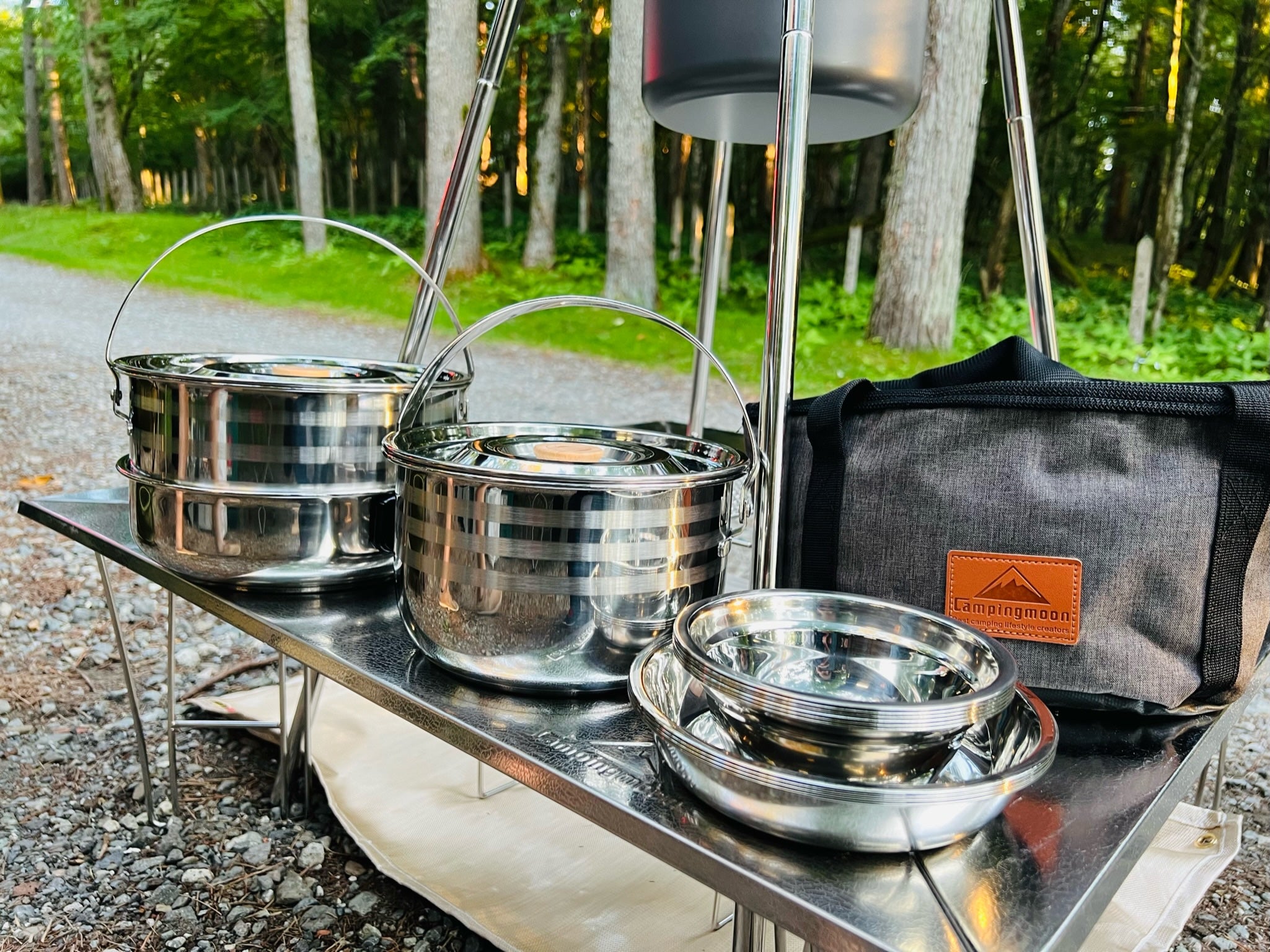 このクッカーセットには無駄という概念が一切ありません。マトリョーシカのように大きな鍋の中に一回り小さい鍋やプライパンがキレイに収まるようにデザインされていて、それぞれ蓋付きの小・中鍋、プライパン、プレートが4枚、ボールが6点、ふきんと耐熱鍋敷で合計15点ものアイテムが詰まっています。また、鍋はステンレス銅材を使用しているため、豪快な炎での使用もOK!大鍋の底版は厚みが2mm、フライパンは4mmと分厚い作りをしています。もちろんIHにも対応しているので、車中泊の際にIHコンロでの使用も問題なく行えます。