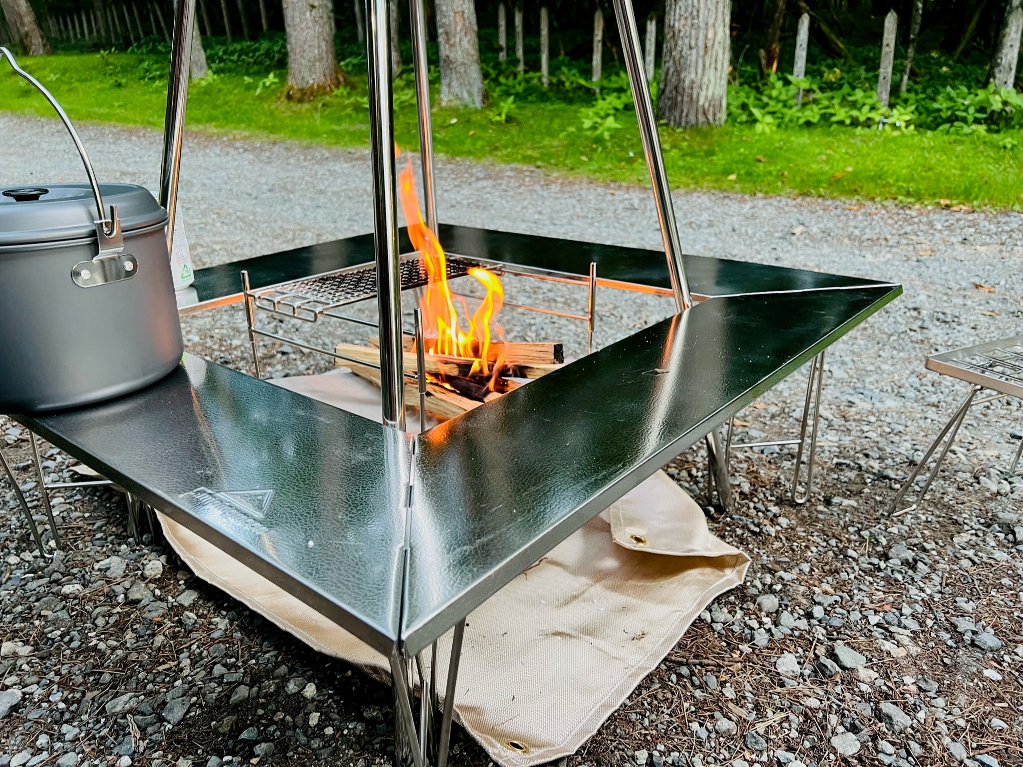 囲炉裏テーブルを使うと、調理に使うまな板と包丁や食材をちょっと置いておく場所が一気に増えて、利便性が上がります。私の経験で一番もやもやするのが、クーラーボックスをテーブル代わりに利用されて、中身を取り出す度に置かれた物をどかさないといけないという事態が非常に嫌いなのですが、置く場所が多くなることで、それが少なくなるのではないかと思います。こういった小さなストレスをなるべく少なくすることで、日常のストレス社会でも許容範囲レベルが引き上がっている気がします。