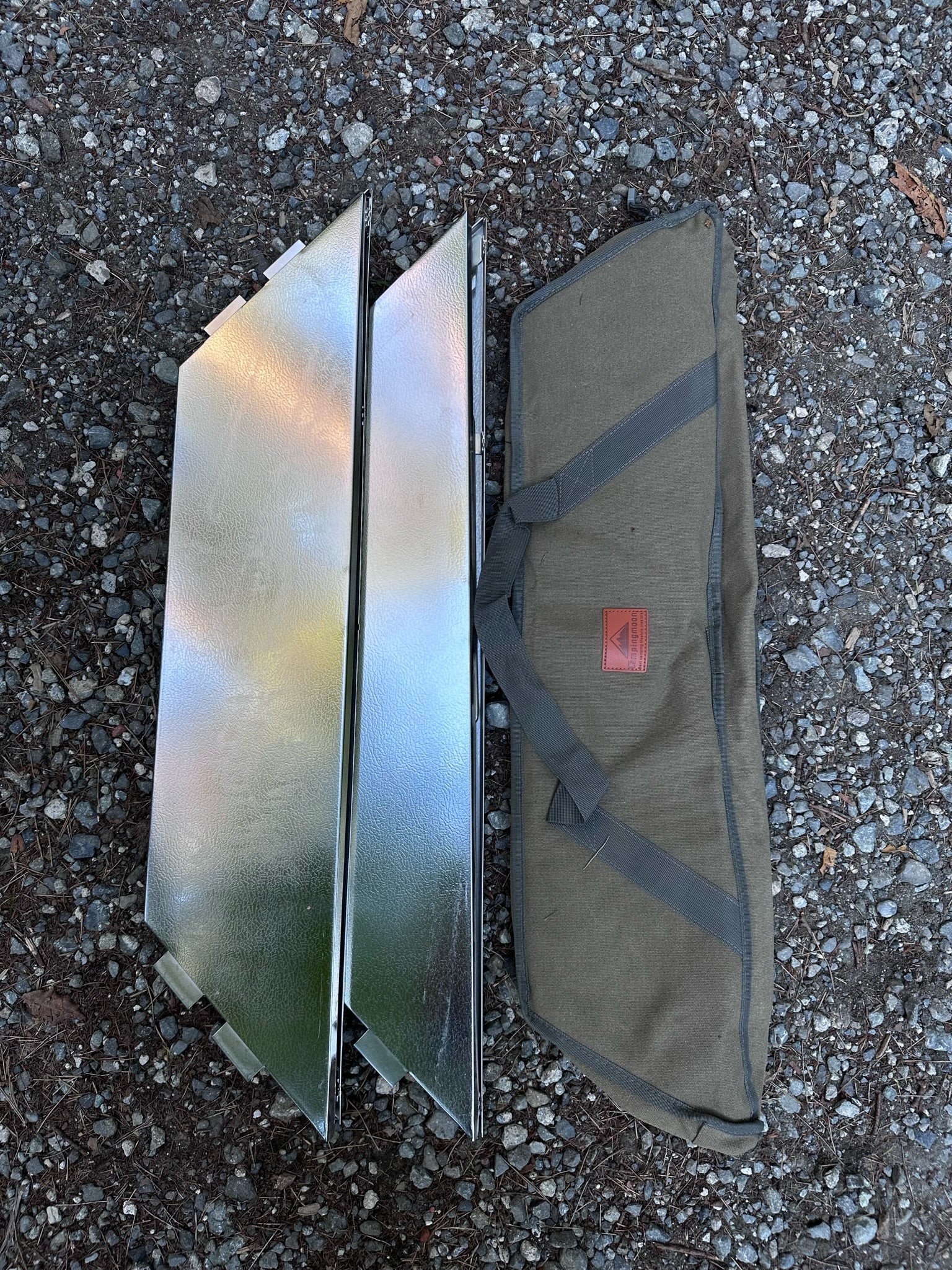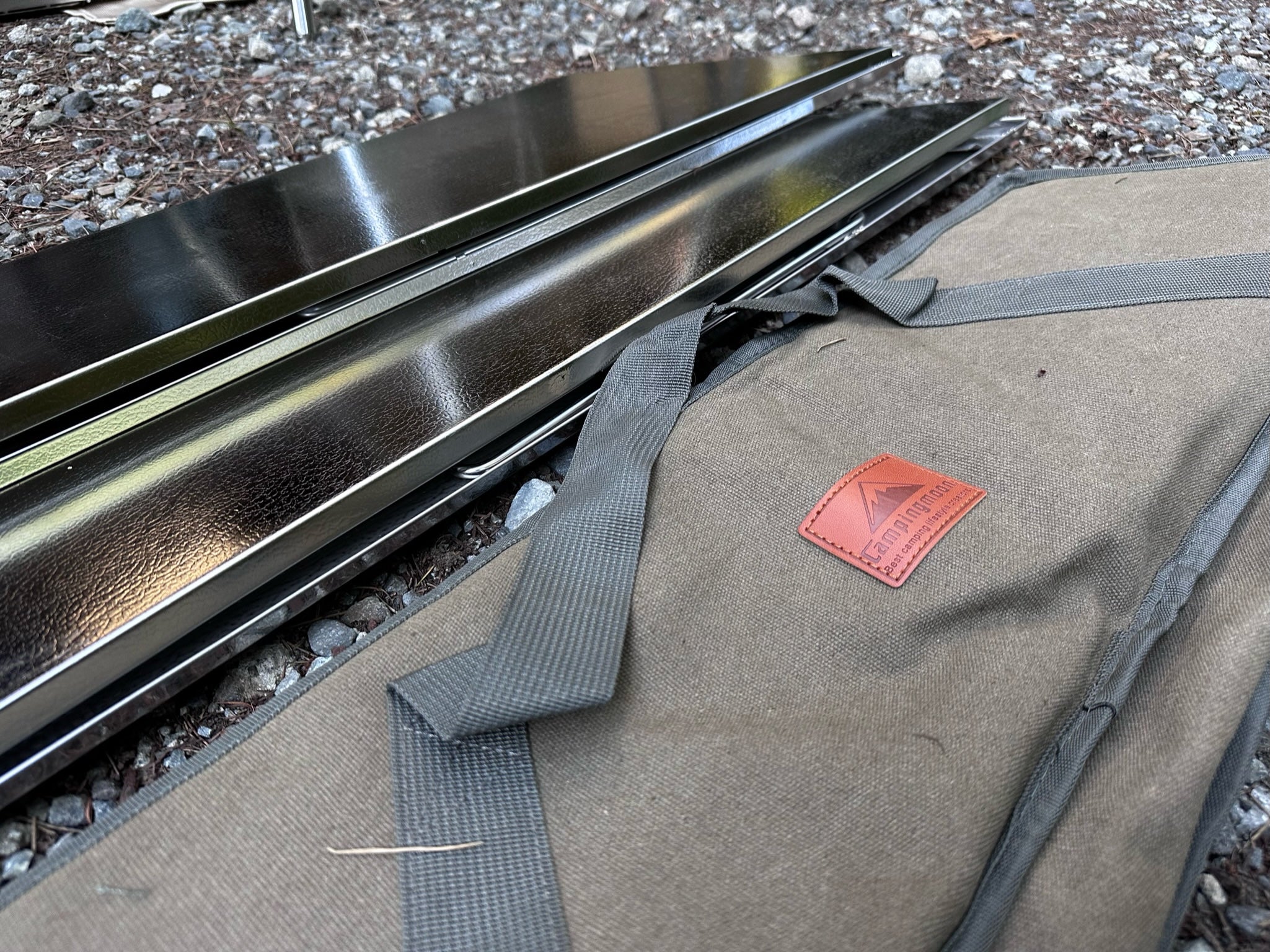 焚き火台を囲炉裏テーブルの真ん中にセットして、1枚1枚の天板を裏返して繋ぎ合わせれば完成です。囲炉裏部分にあたる部分は50cm角で空いていて、片面約84cmあるので、かなり広々使えるかと思います。