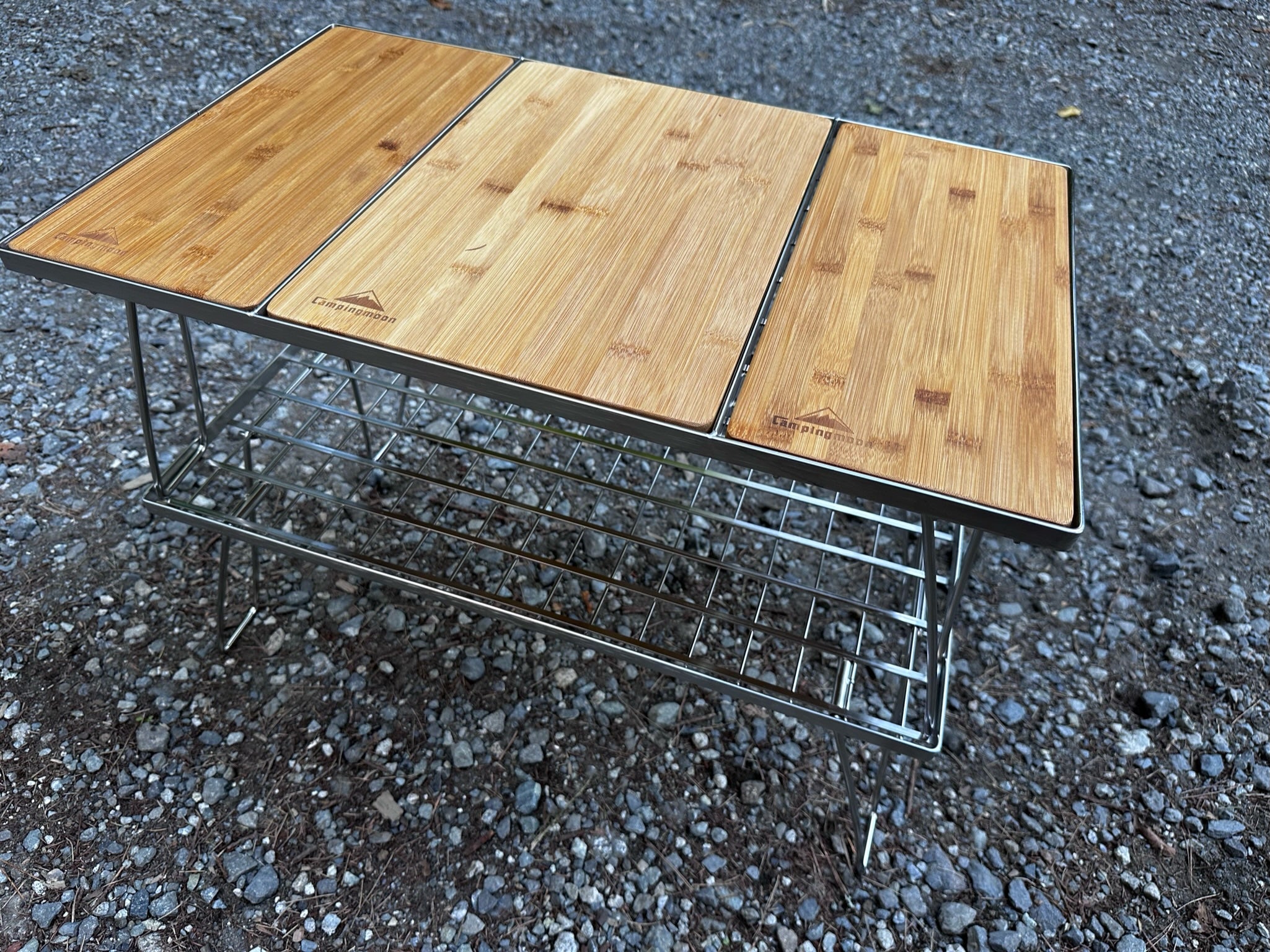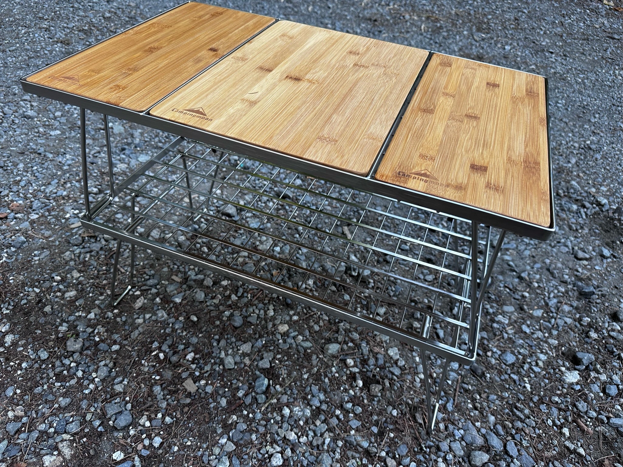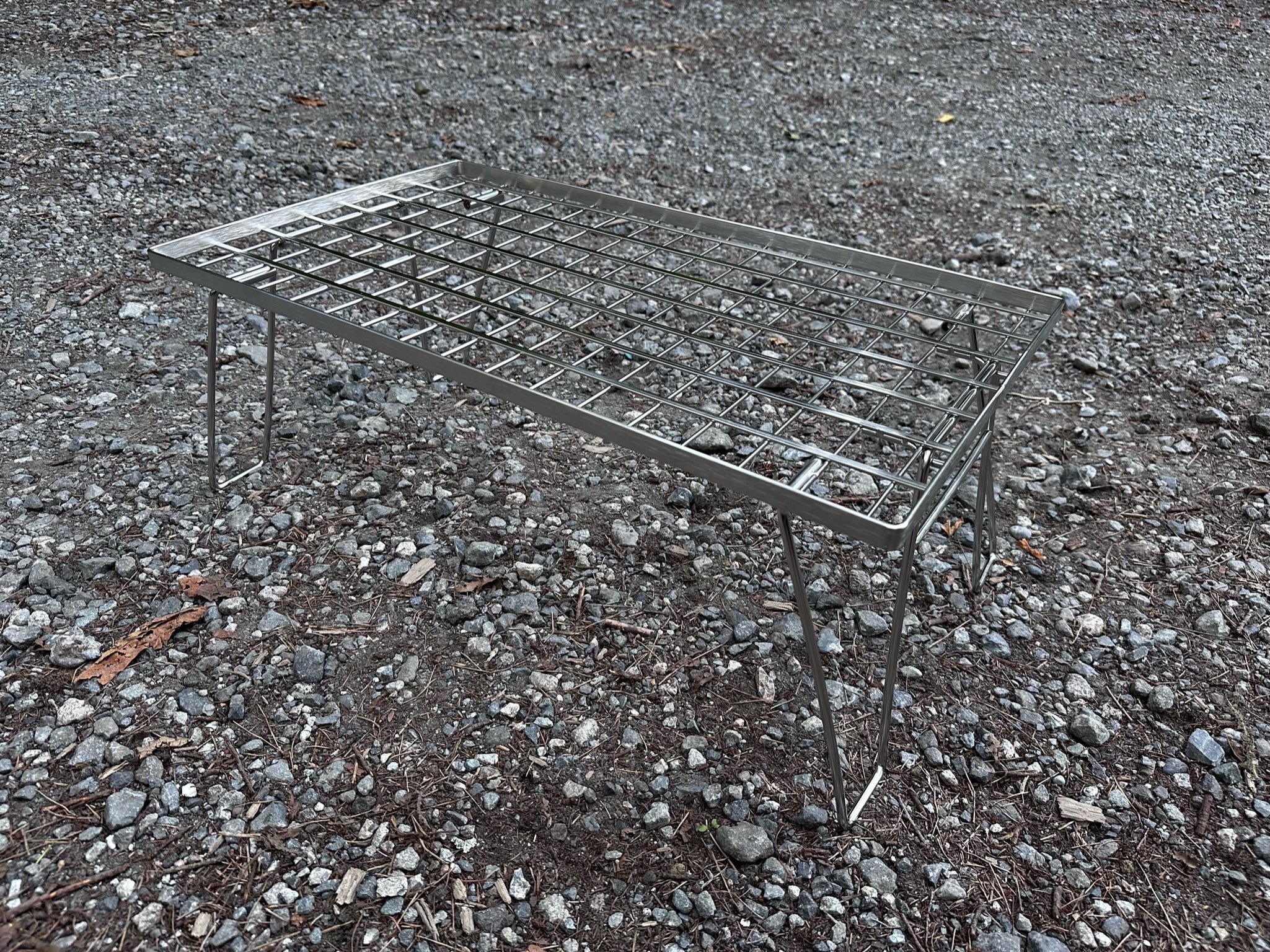 ローテーブルとして使えるステンレス製のフィールドラックです。同じ組み立て方ではありますが、竹製の天板が入るのは一回り大きく出来ている方のみです。