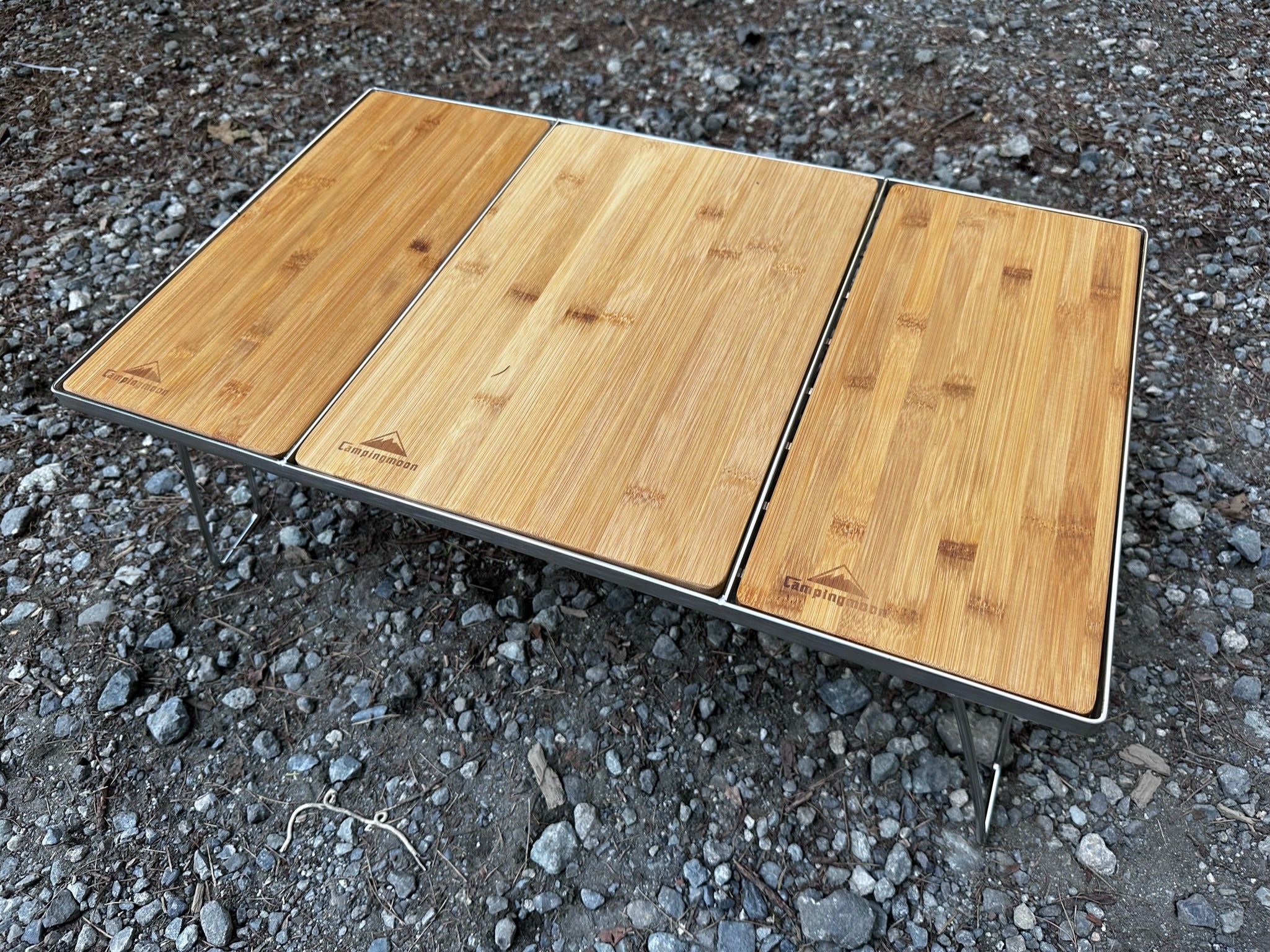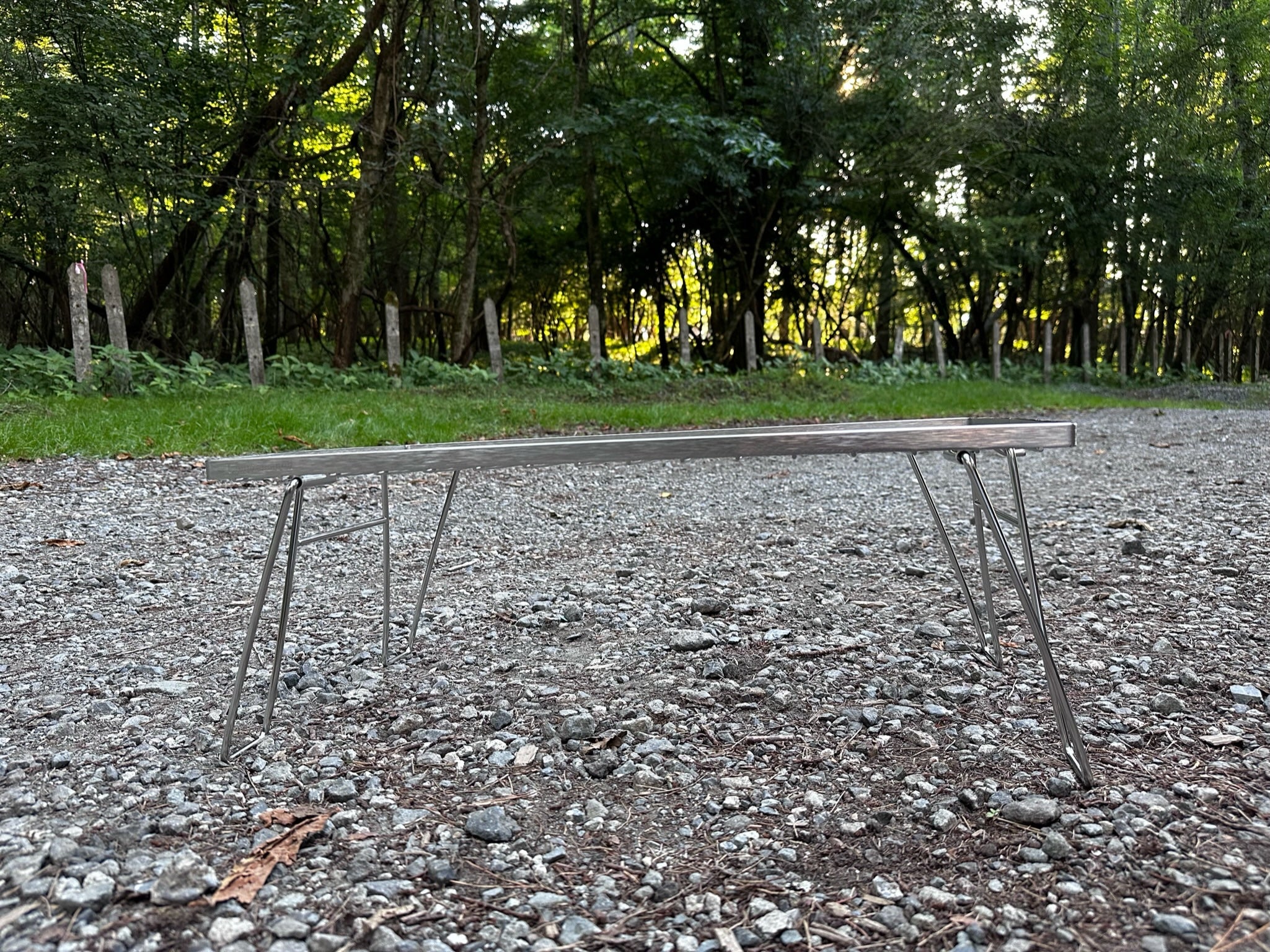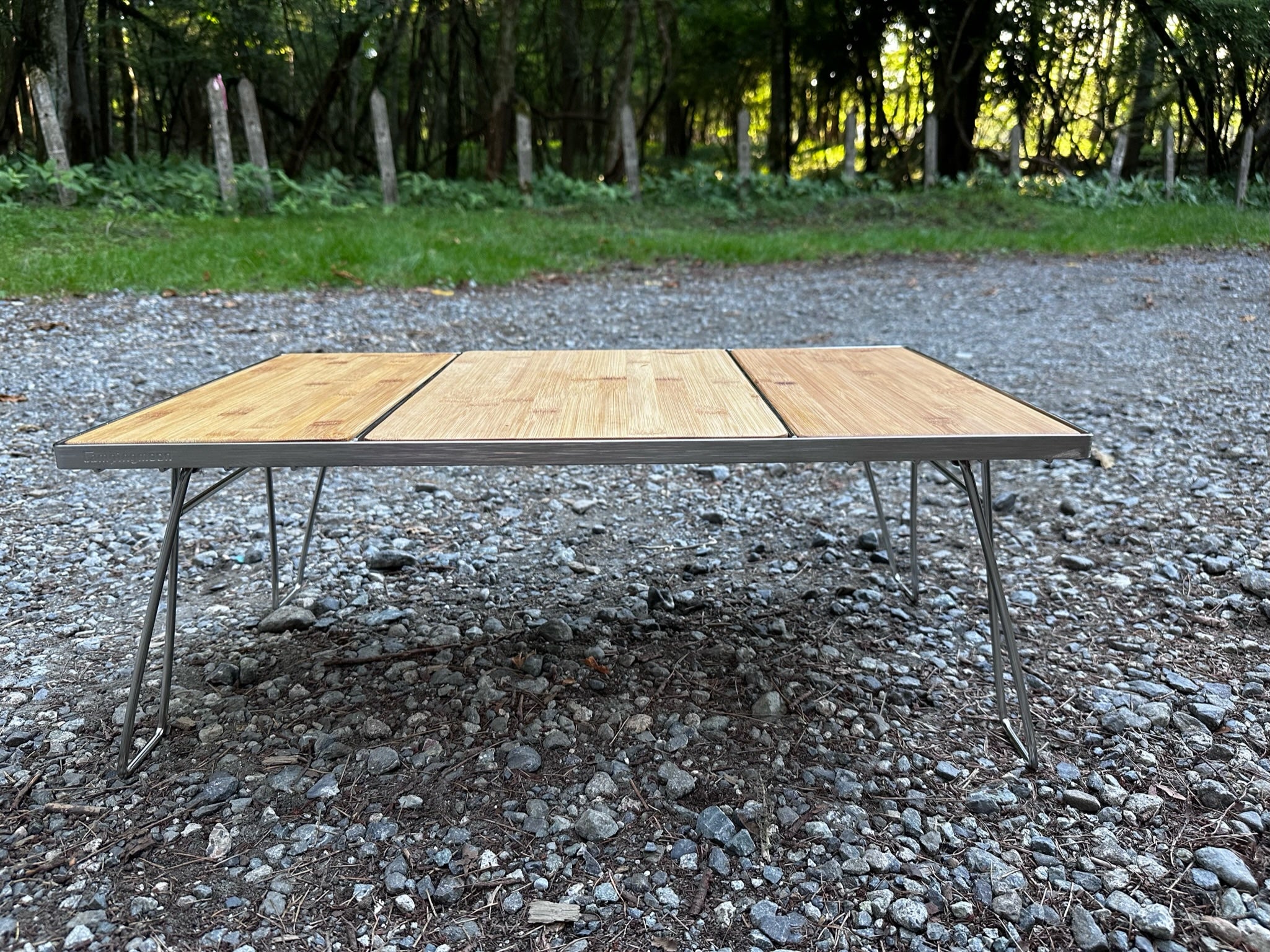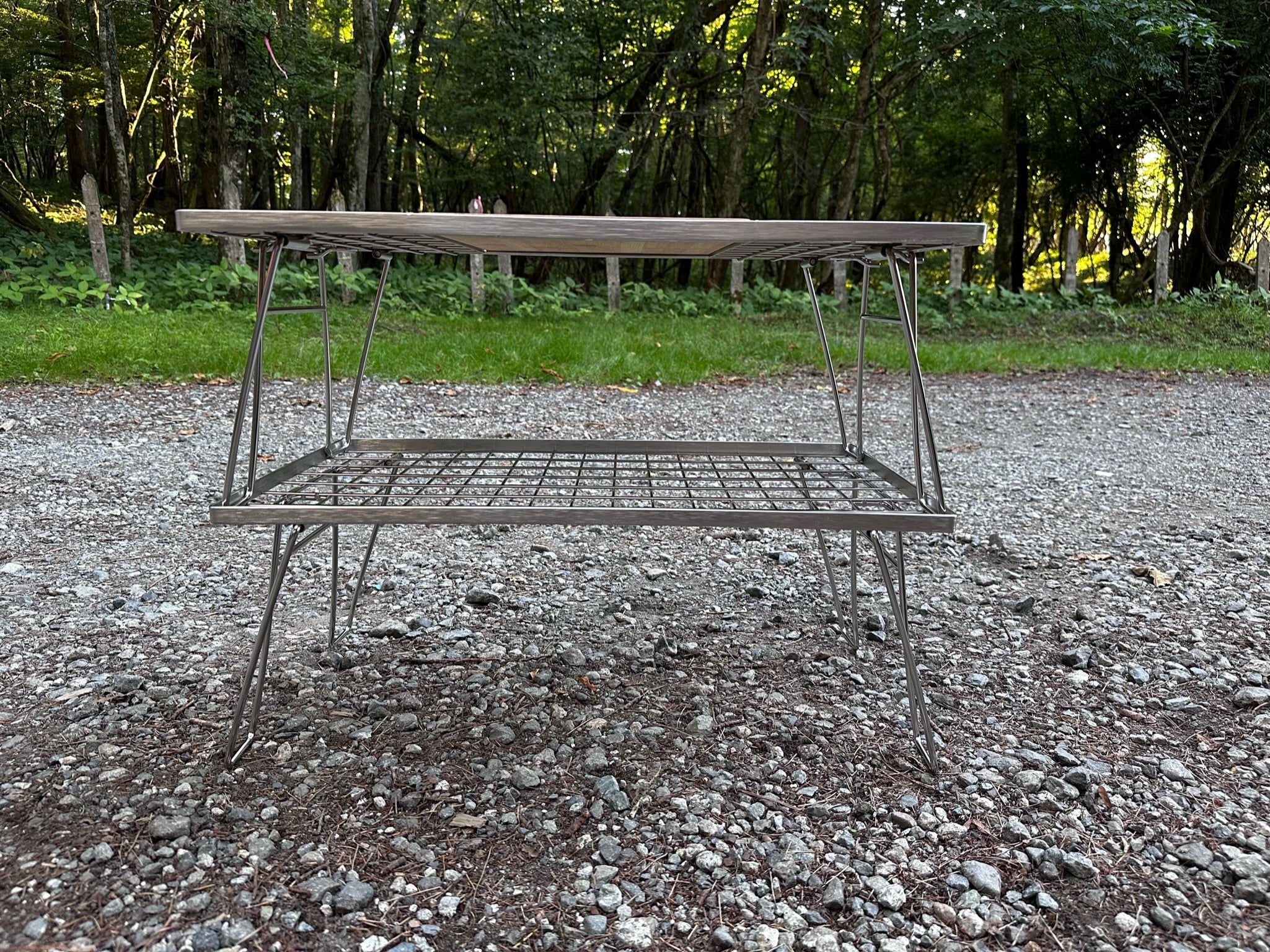 ローテーブルとして使えるステンレス製のフィールドラックです。同じ組み立て方ではありますが、竹製の天板が入るのは一回り大きく出来ている方のみです。