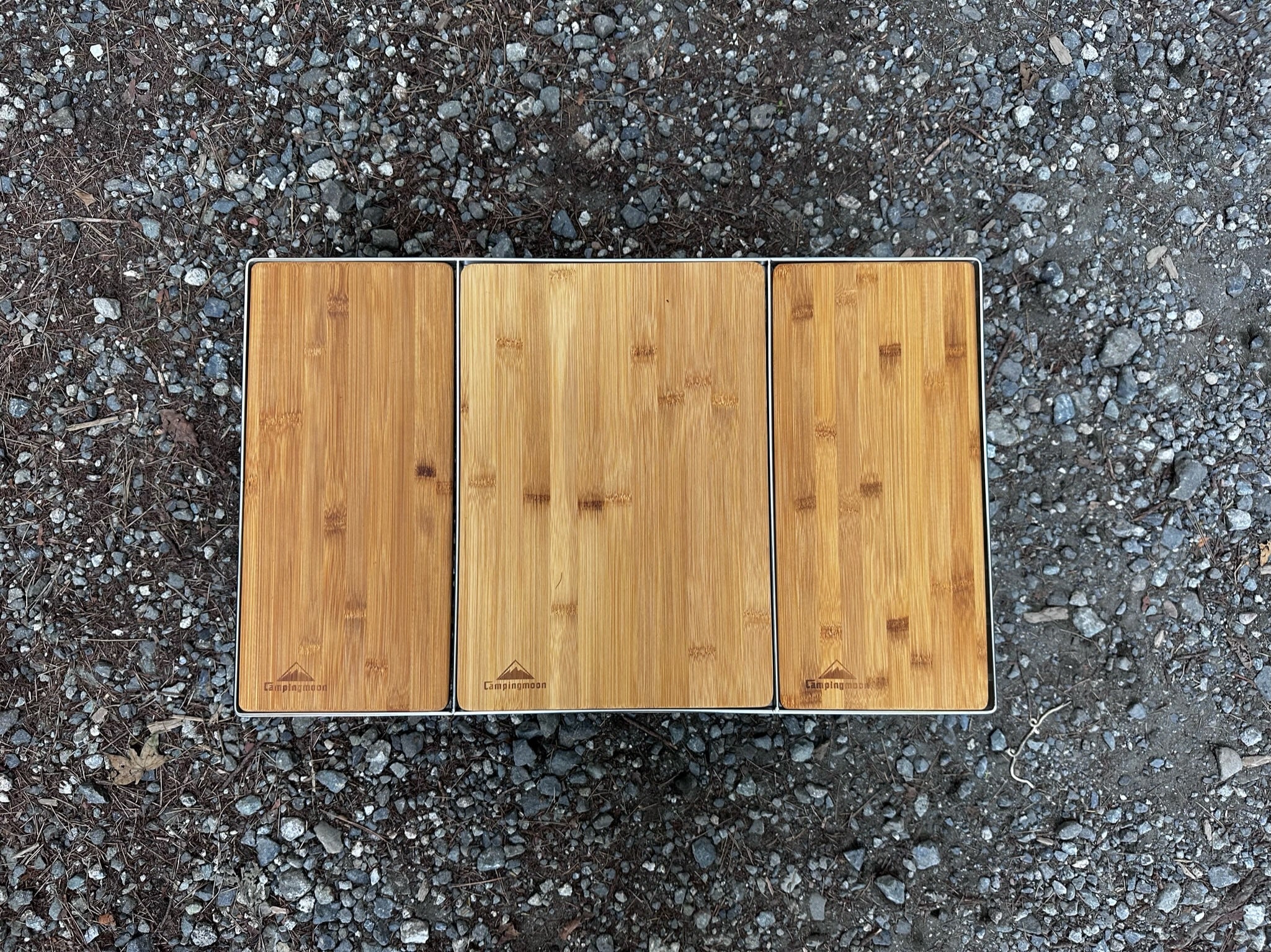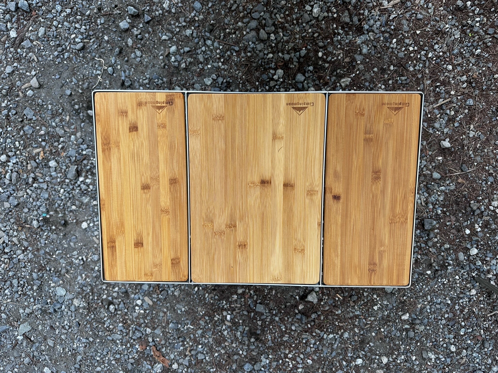 竹製の天板は3つに分かれているのですが、一番大きな天板を開ければ、SNOWPEAKのフラットバーナー・プレートバーナー・雪峰苑をインストールできとても便利です。