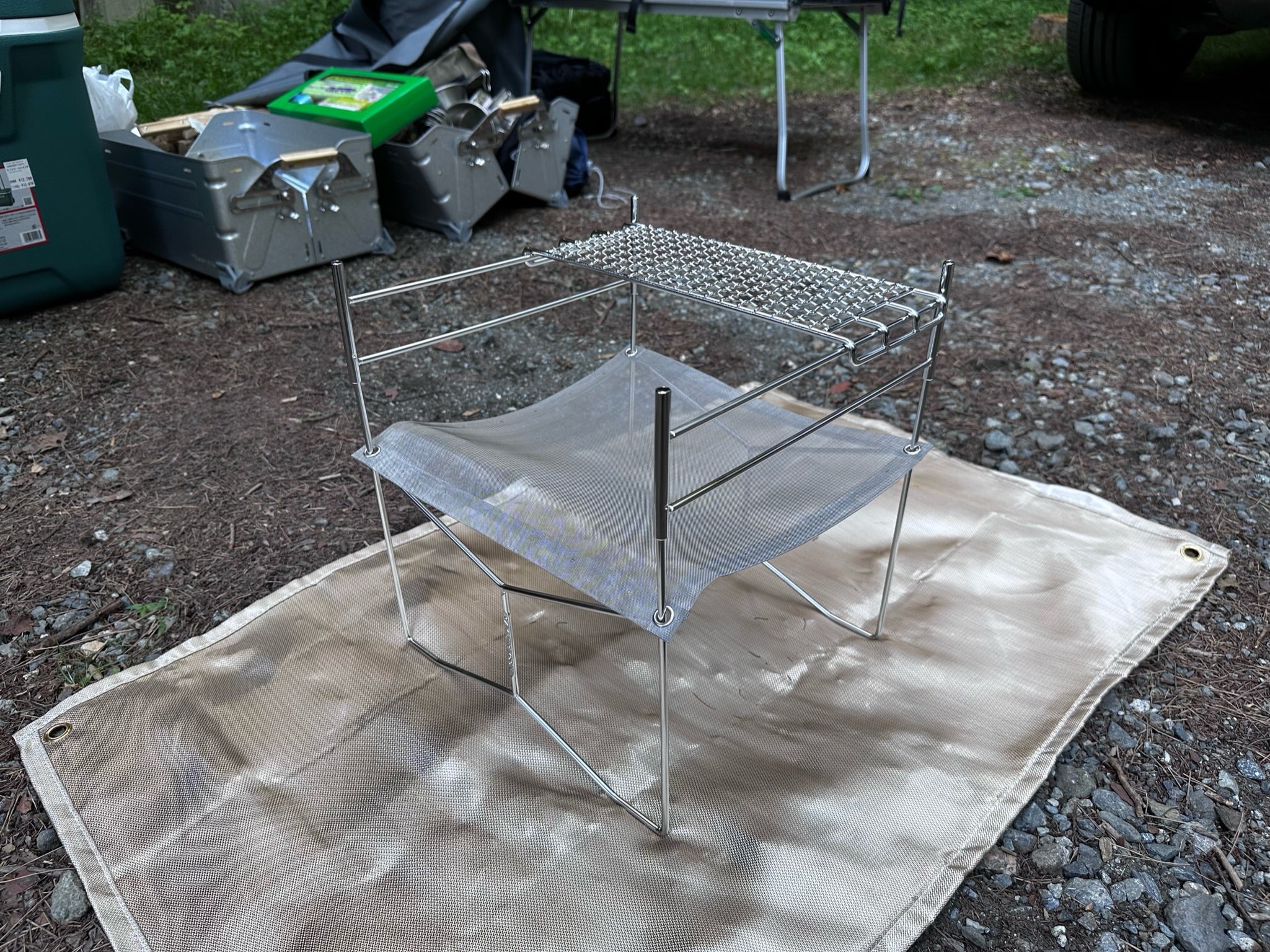 組み立て自体はフレームを何箇所かにはめて、薪を置くメッシュのシートを被せて完成。