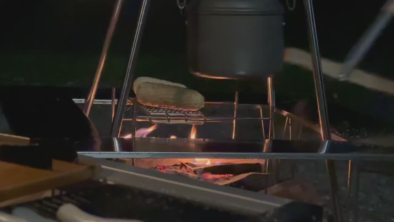 鉄板やトウモロコシなどの比較的大きめな食材がおけるグリルブリッジは火の強さによって上下2段に分かれているので、焚き火ではなかなか難しい火加減を調整もできます。